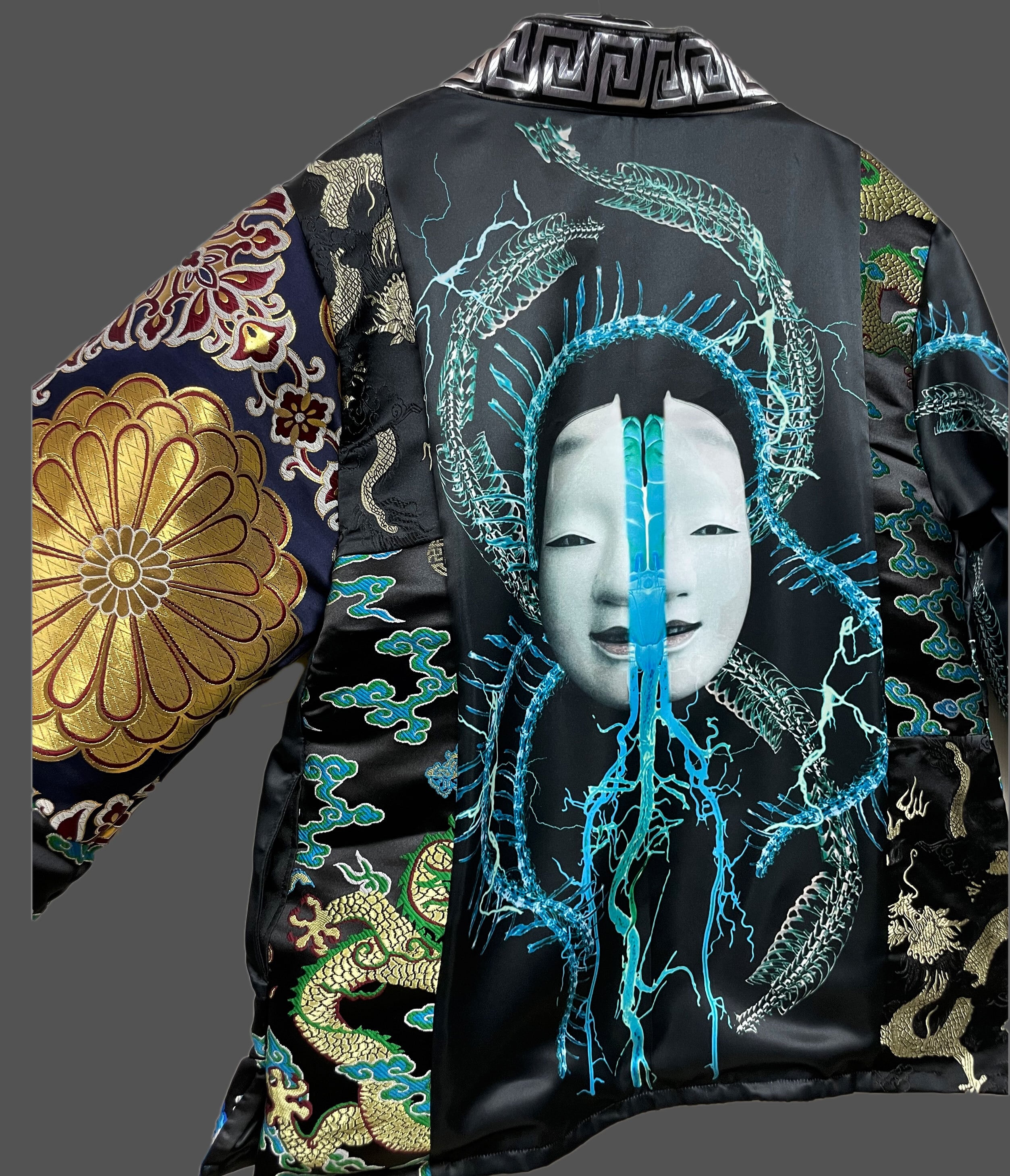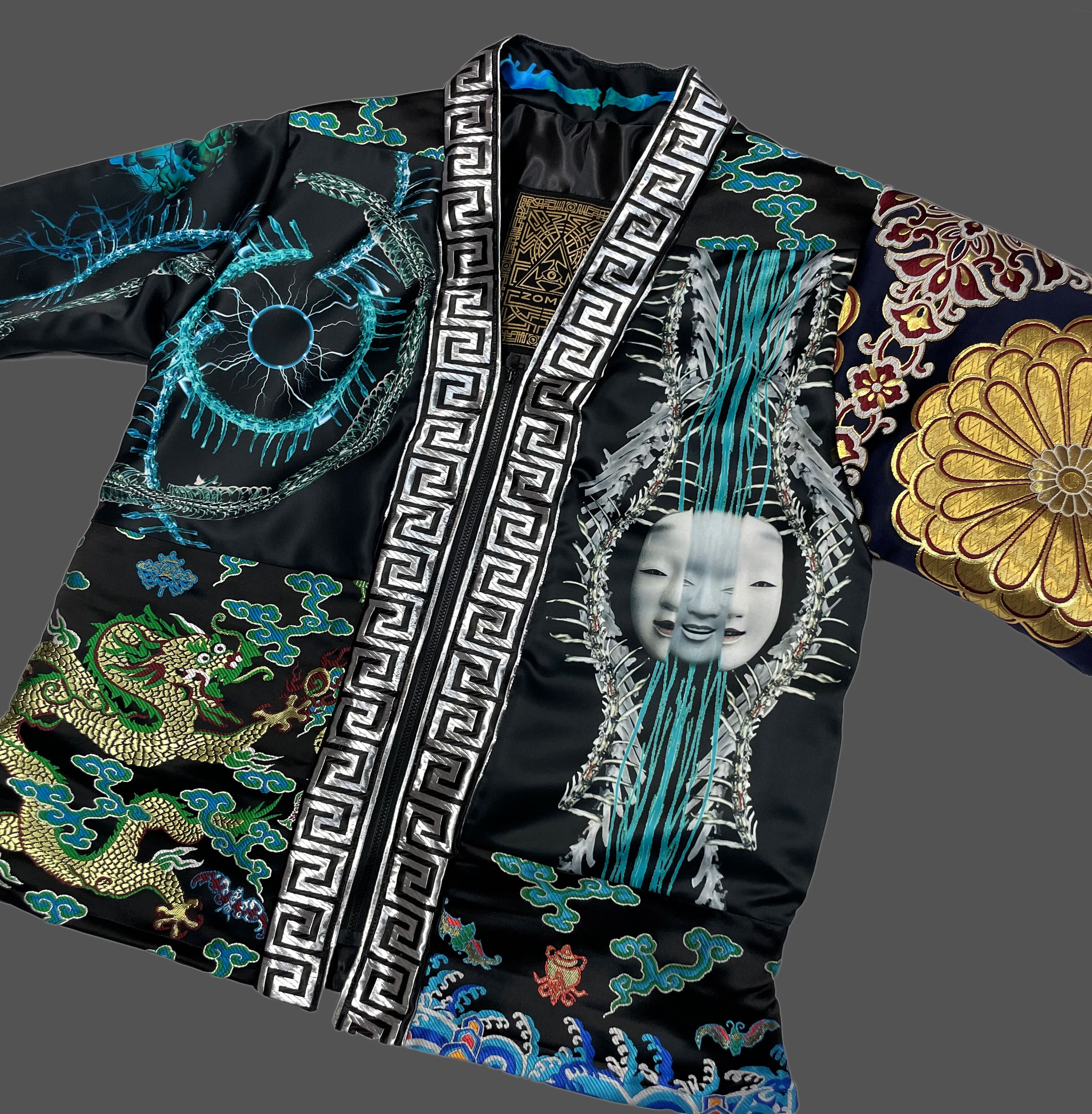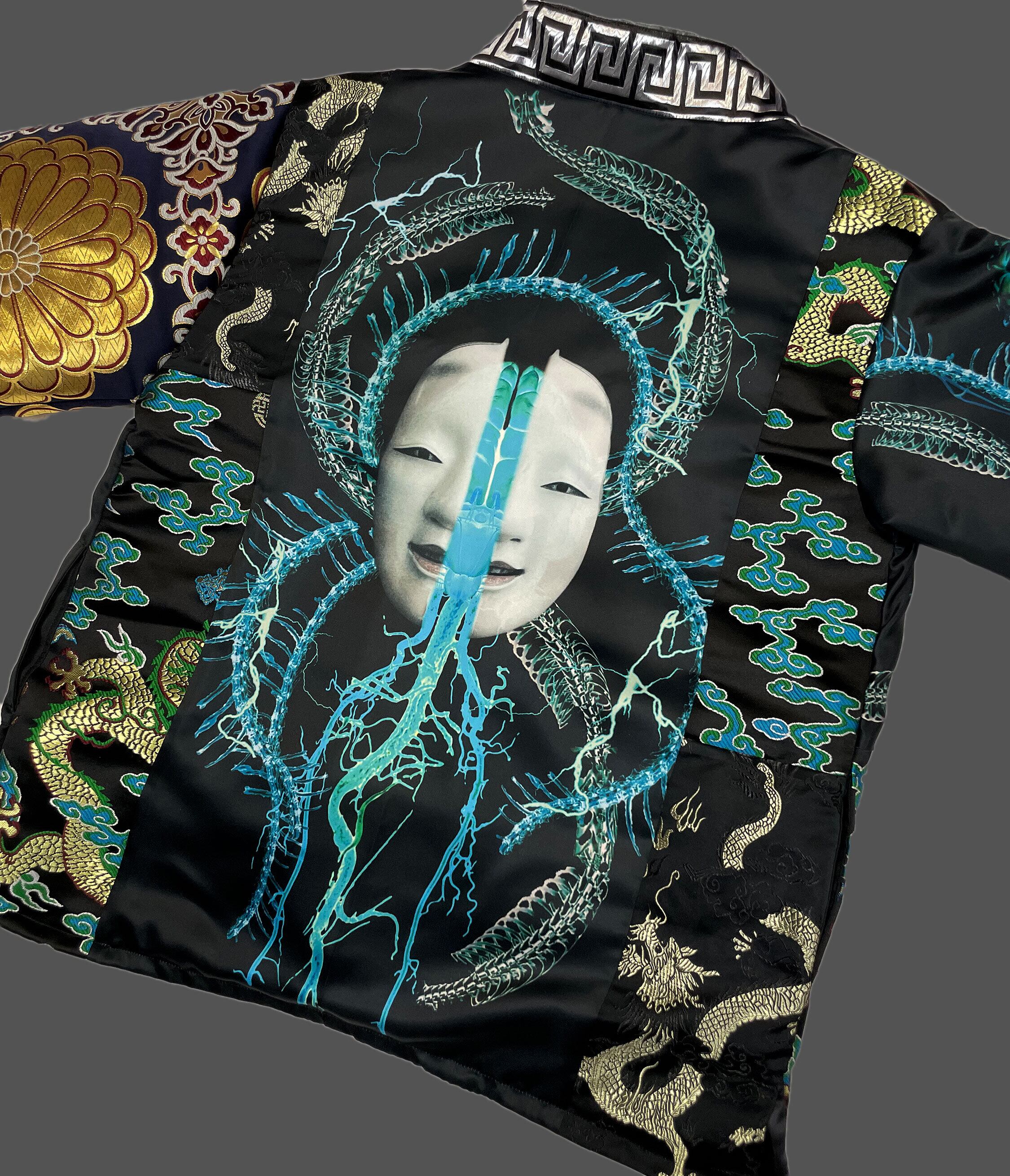 プリント生地(ポリエステルスウェード)と金襴生地のドッキング羽織となります。