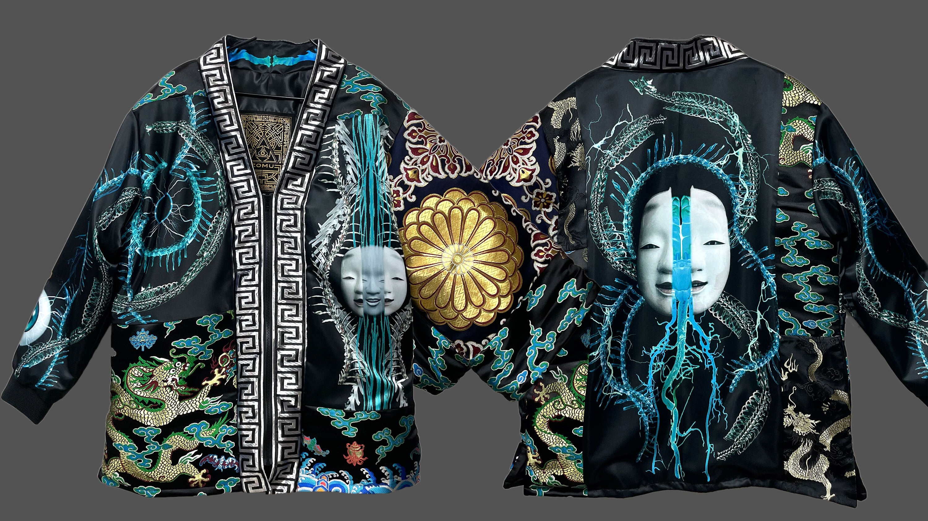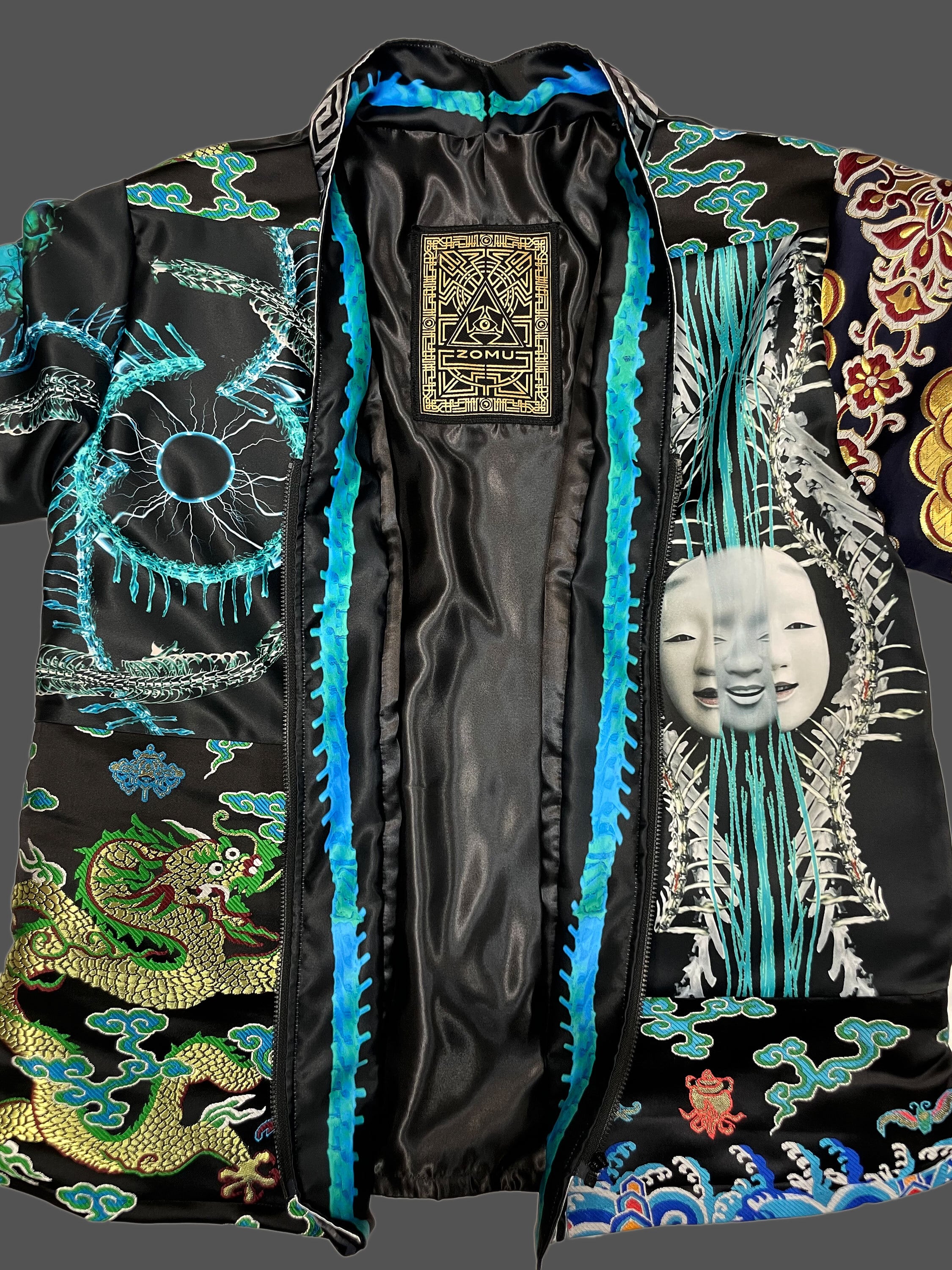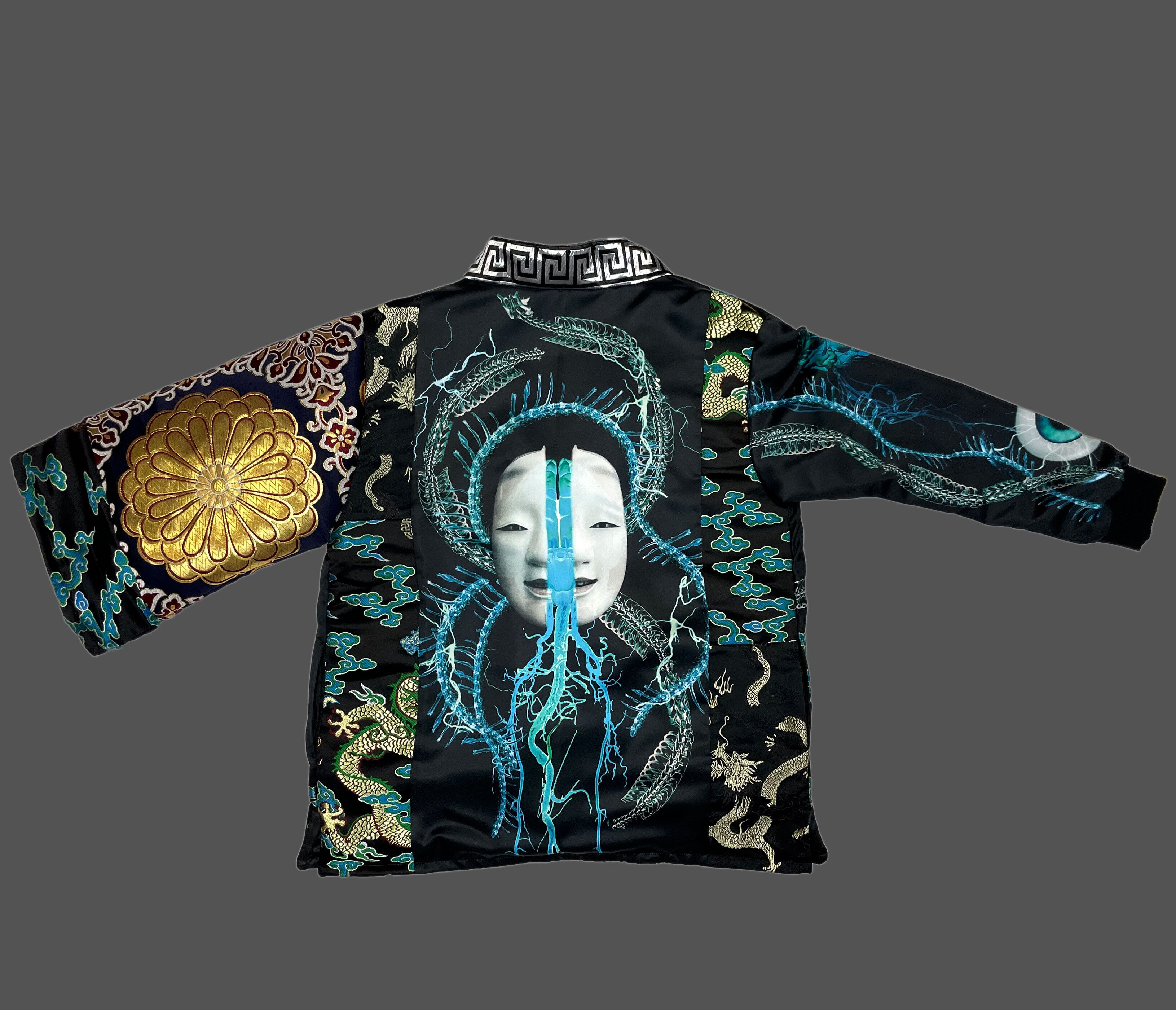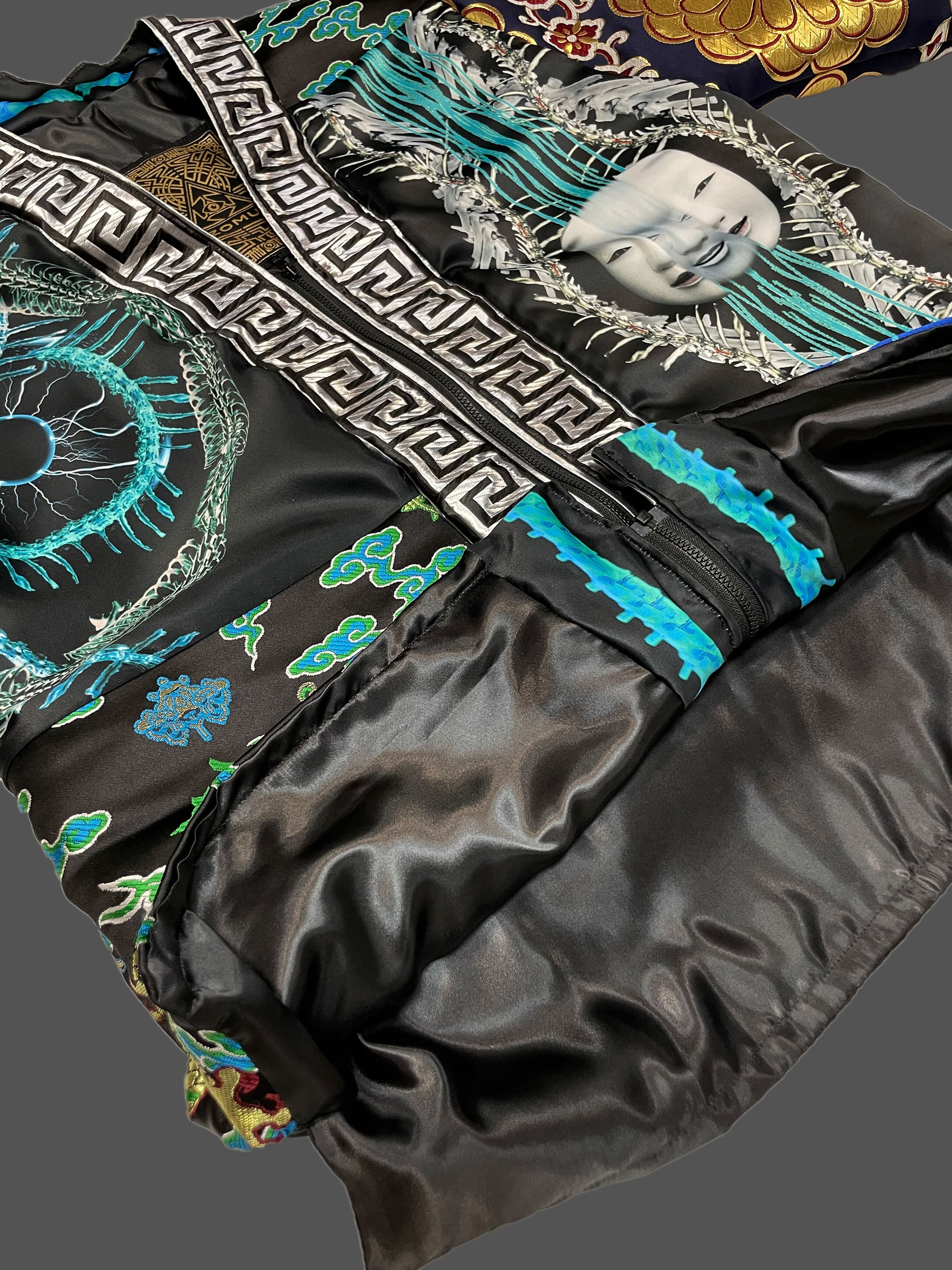 プリント生地(ポリエステルスウェード)と金襴生地のドッキング羽織となります。