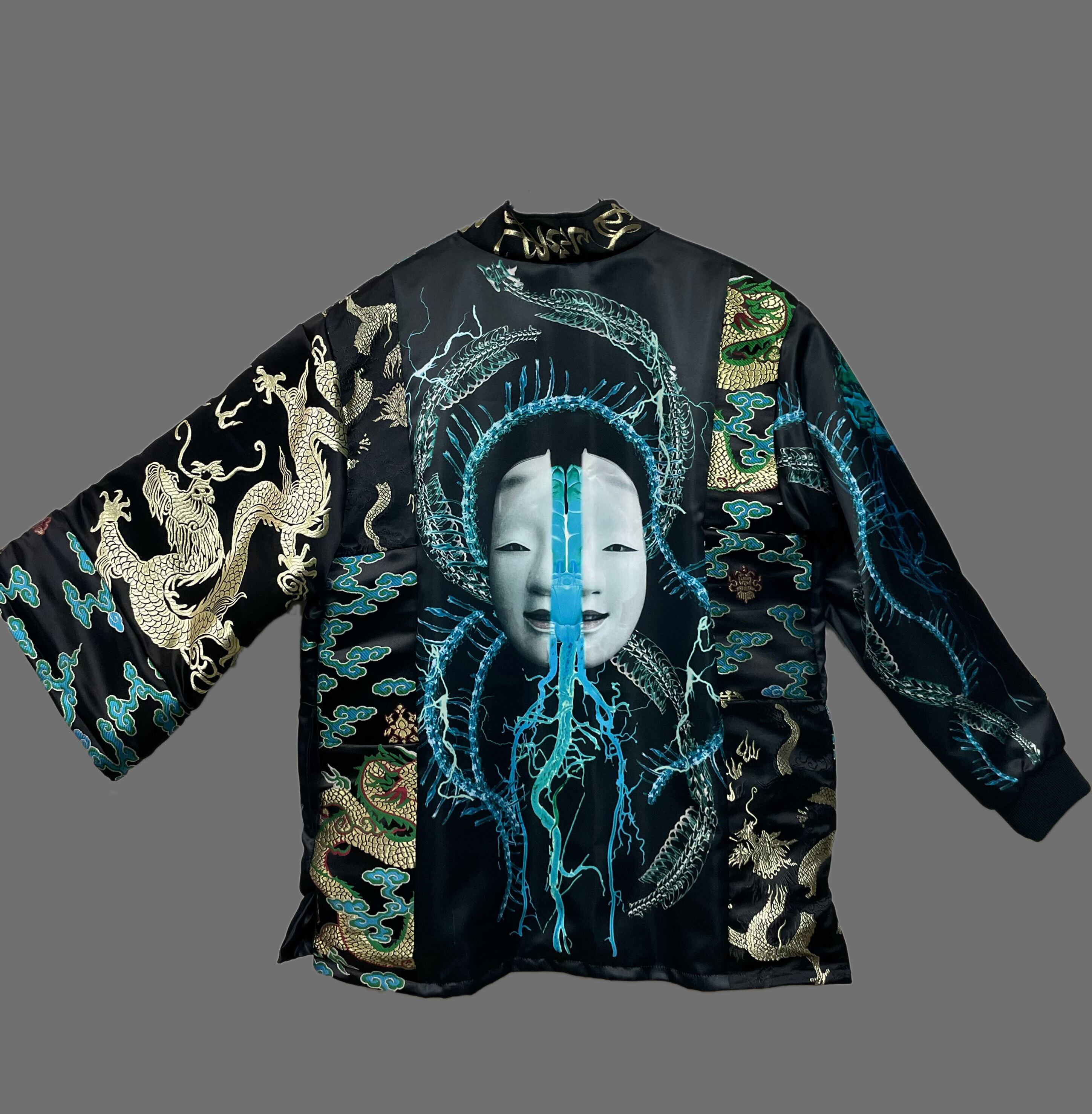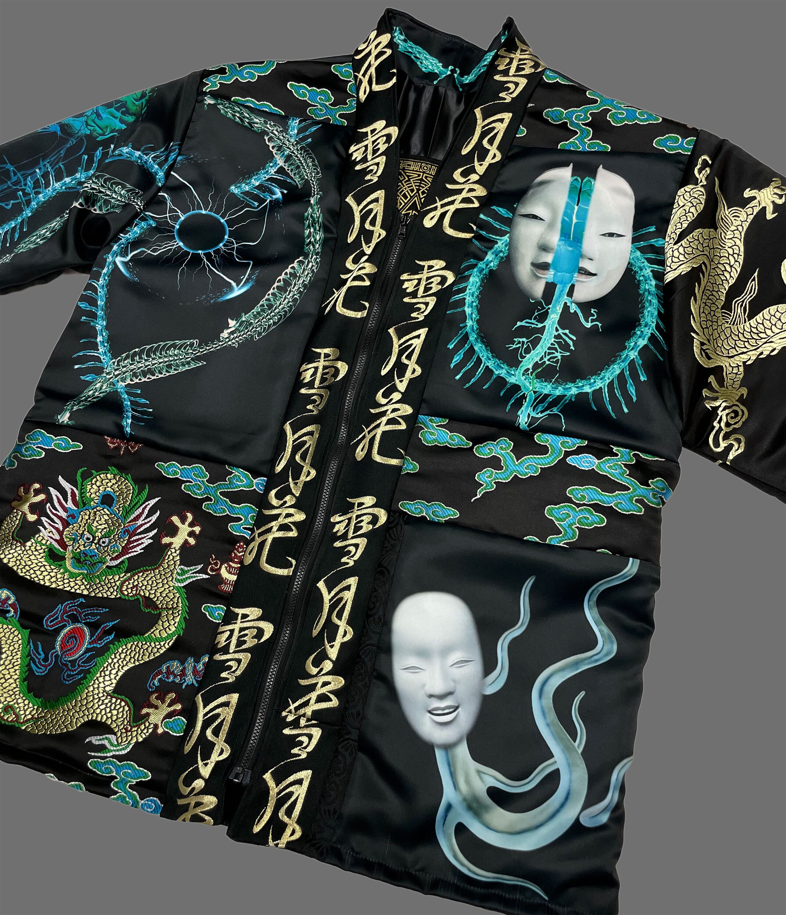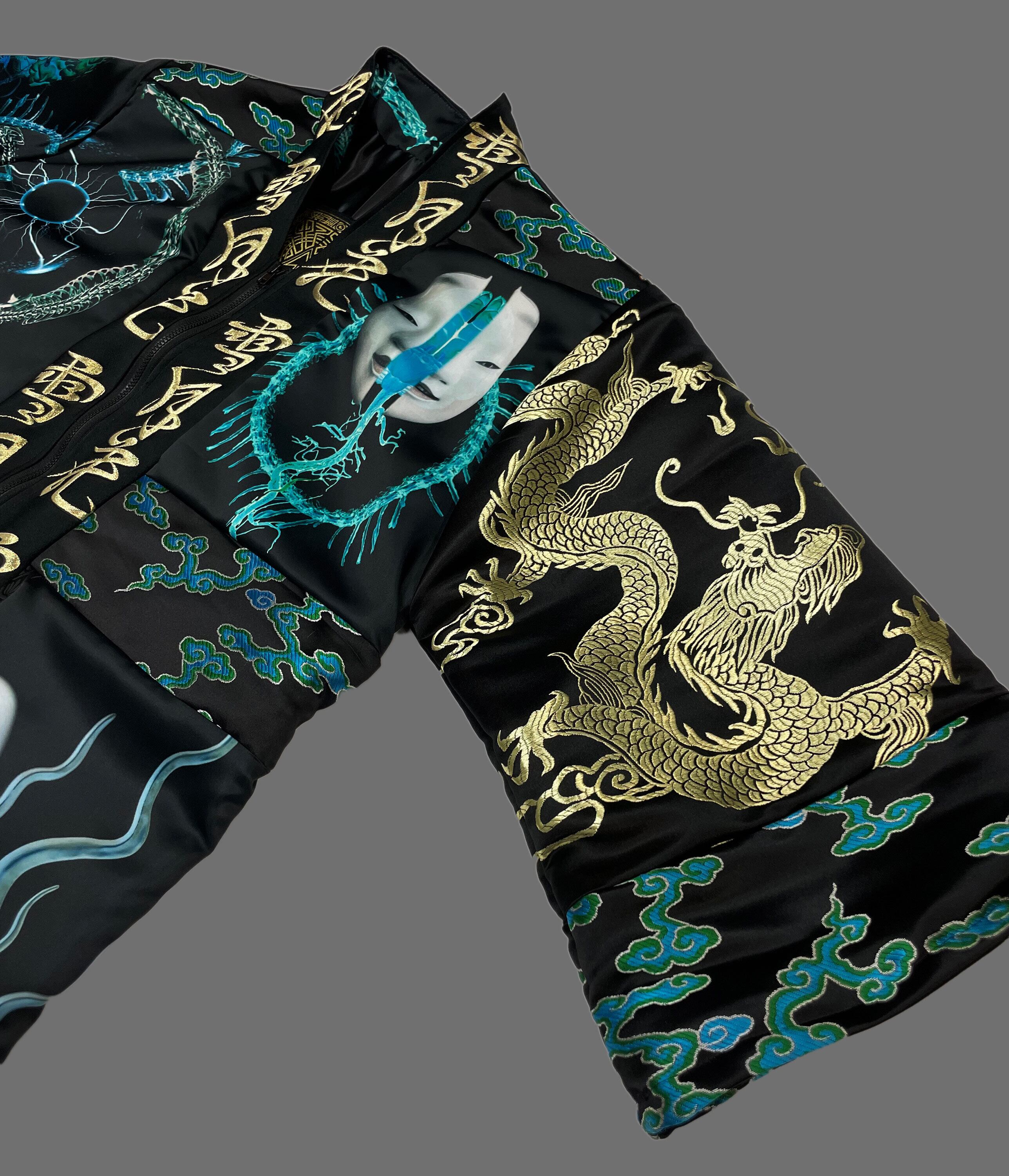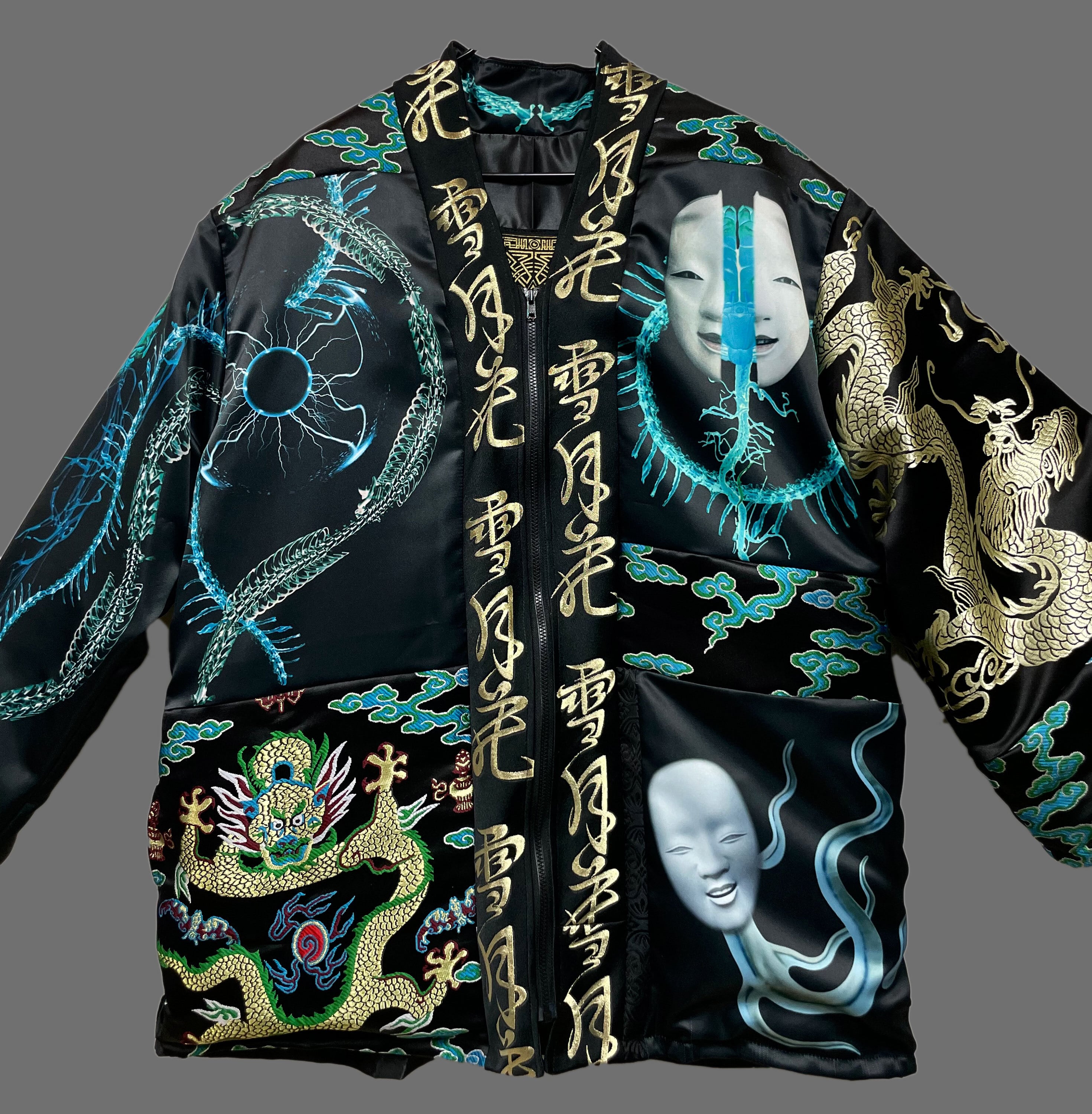 プリント生地(ポリエステルスウェード)と金襴刺繍生地のドッキング羽織となります。