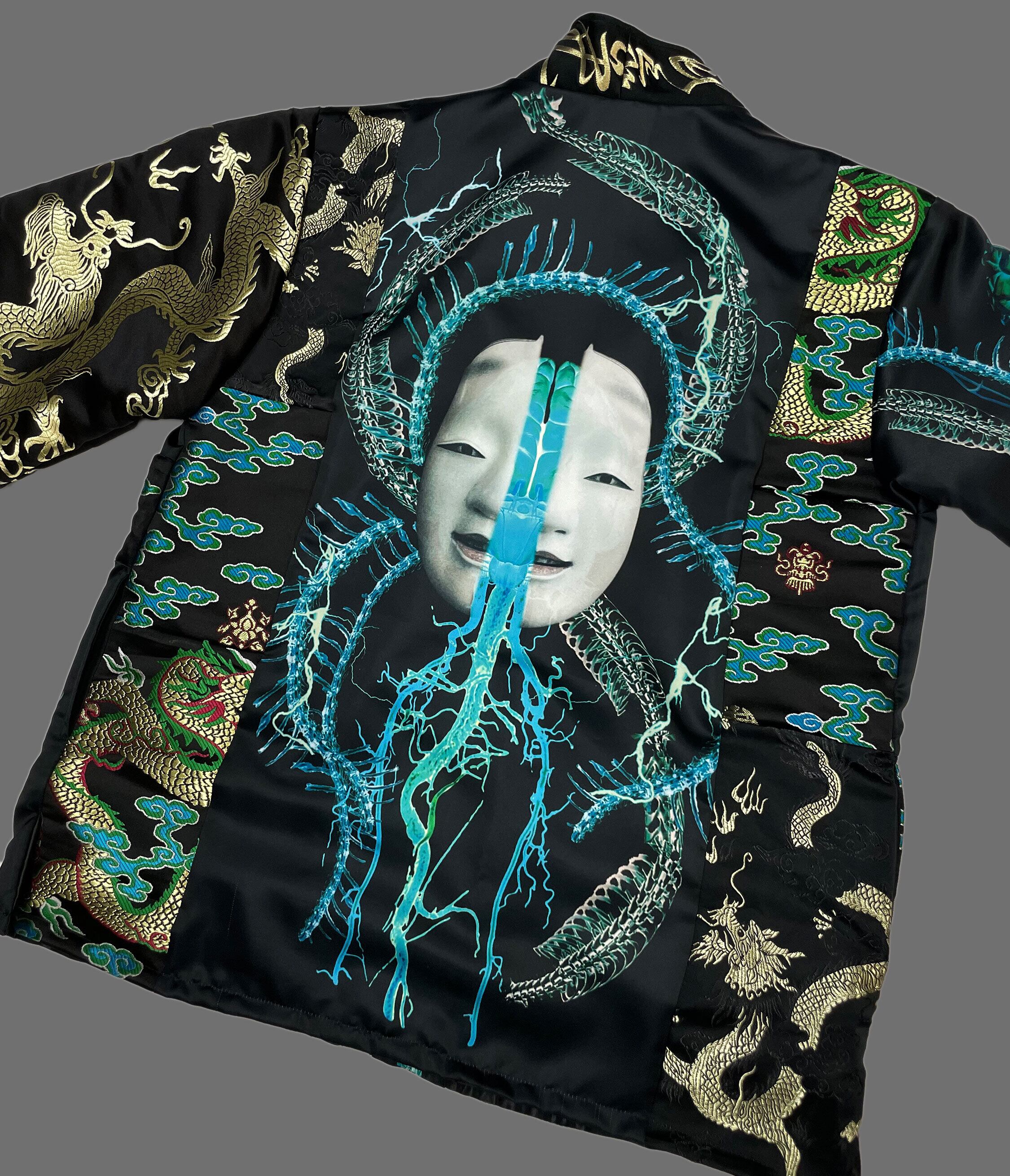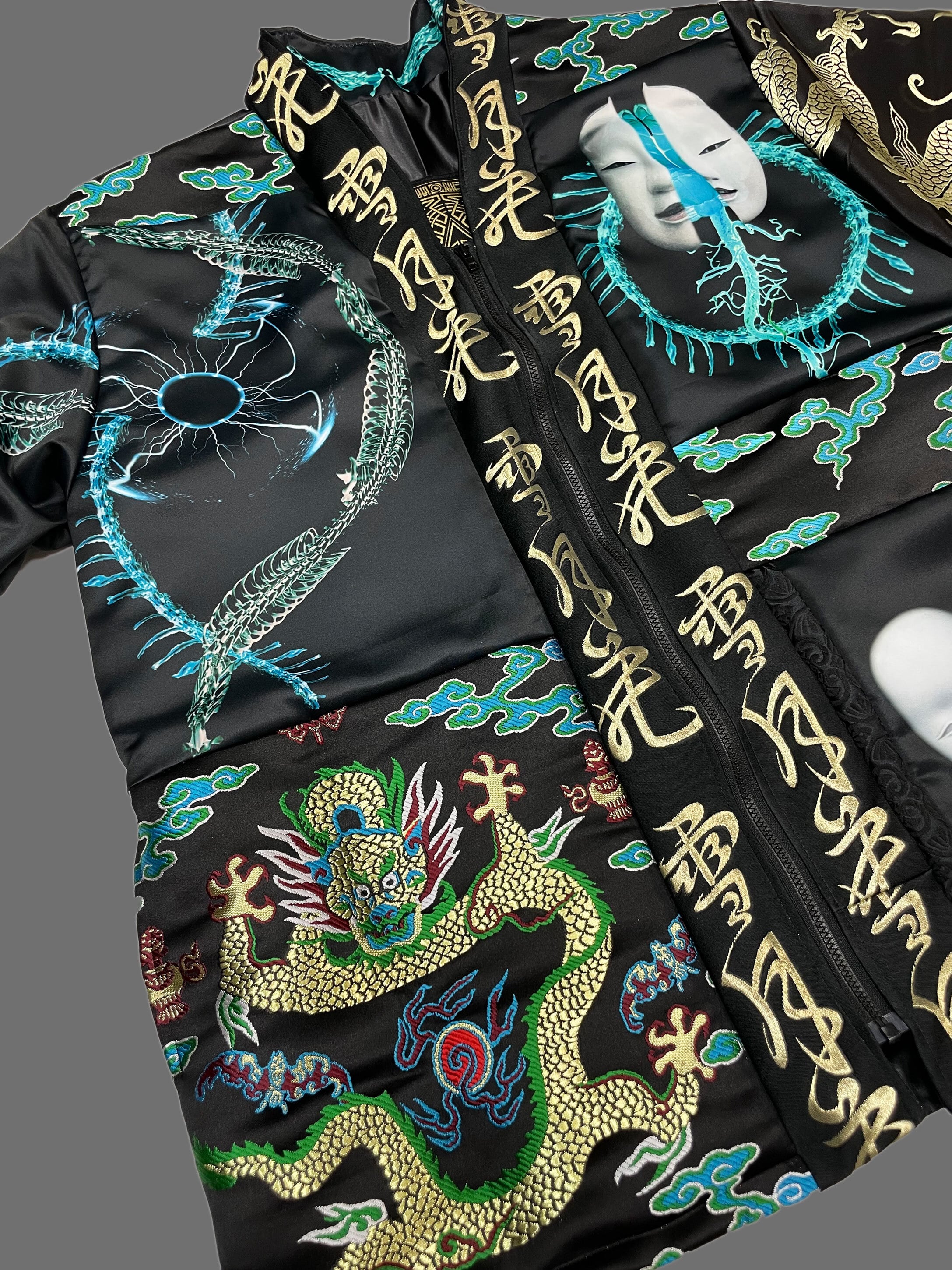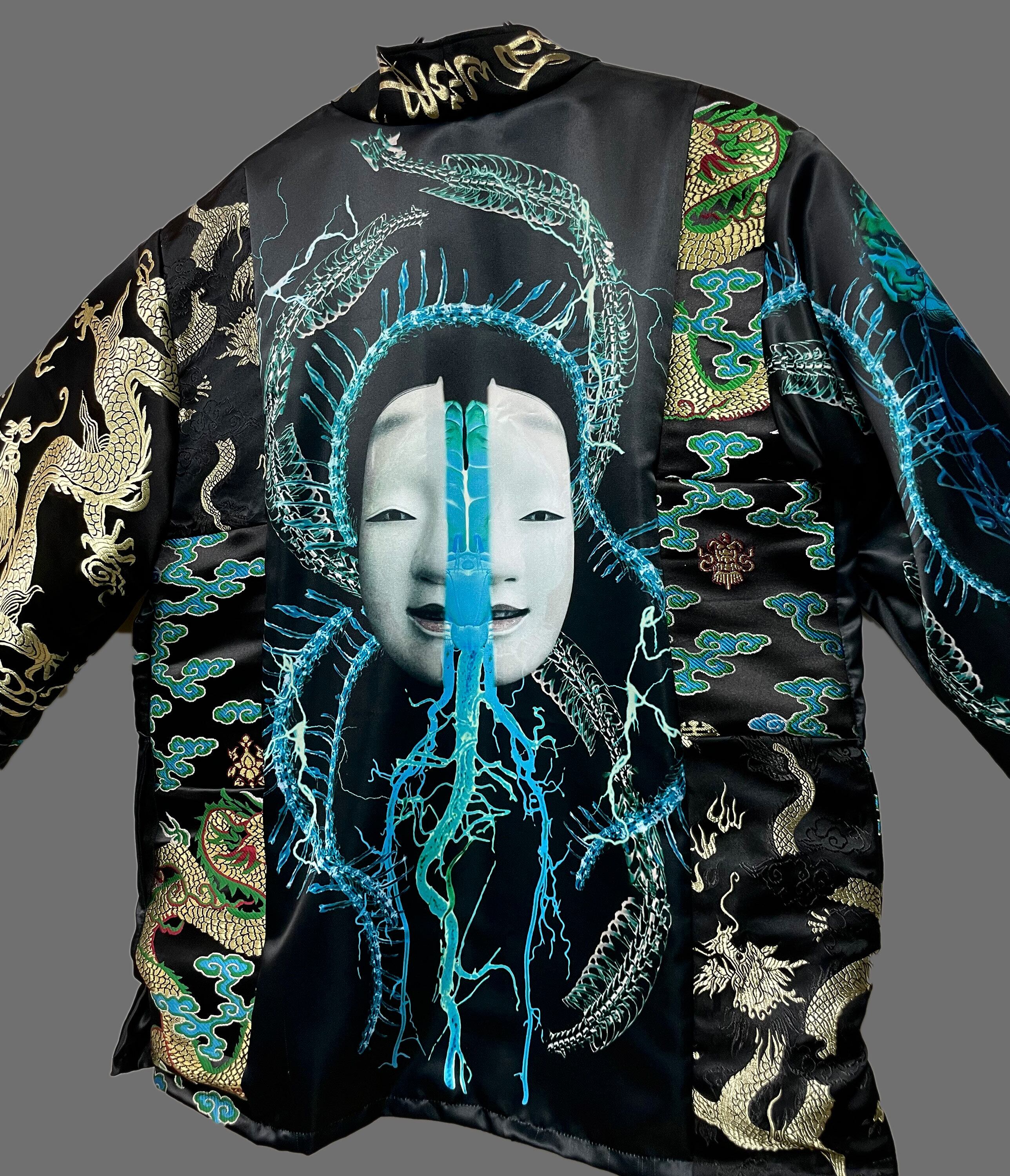 プリント生地(ポリエステルスウェード)と金襴刺繍生地のドッキング羽織となります。
