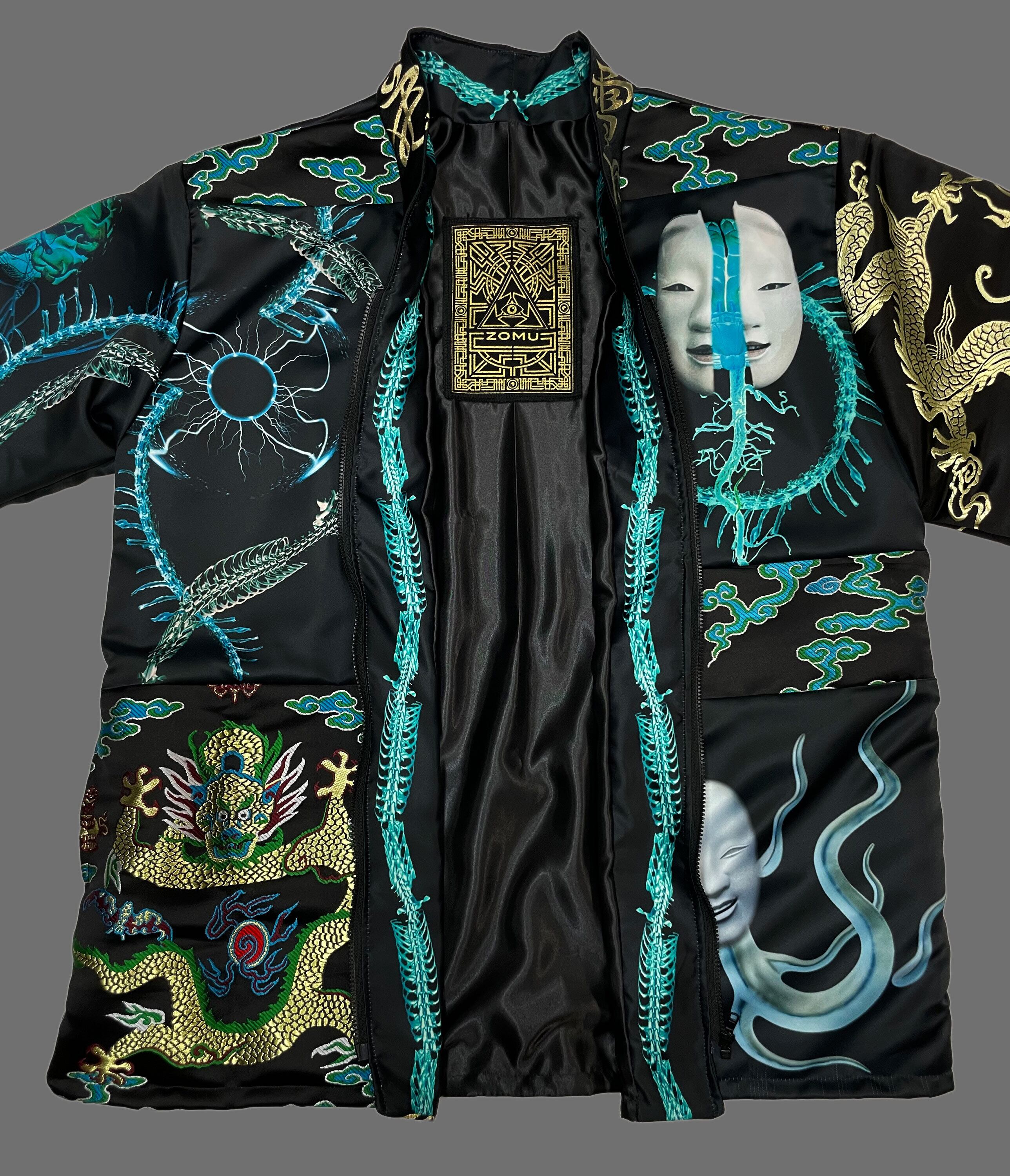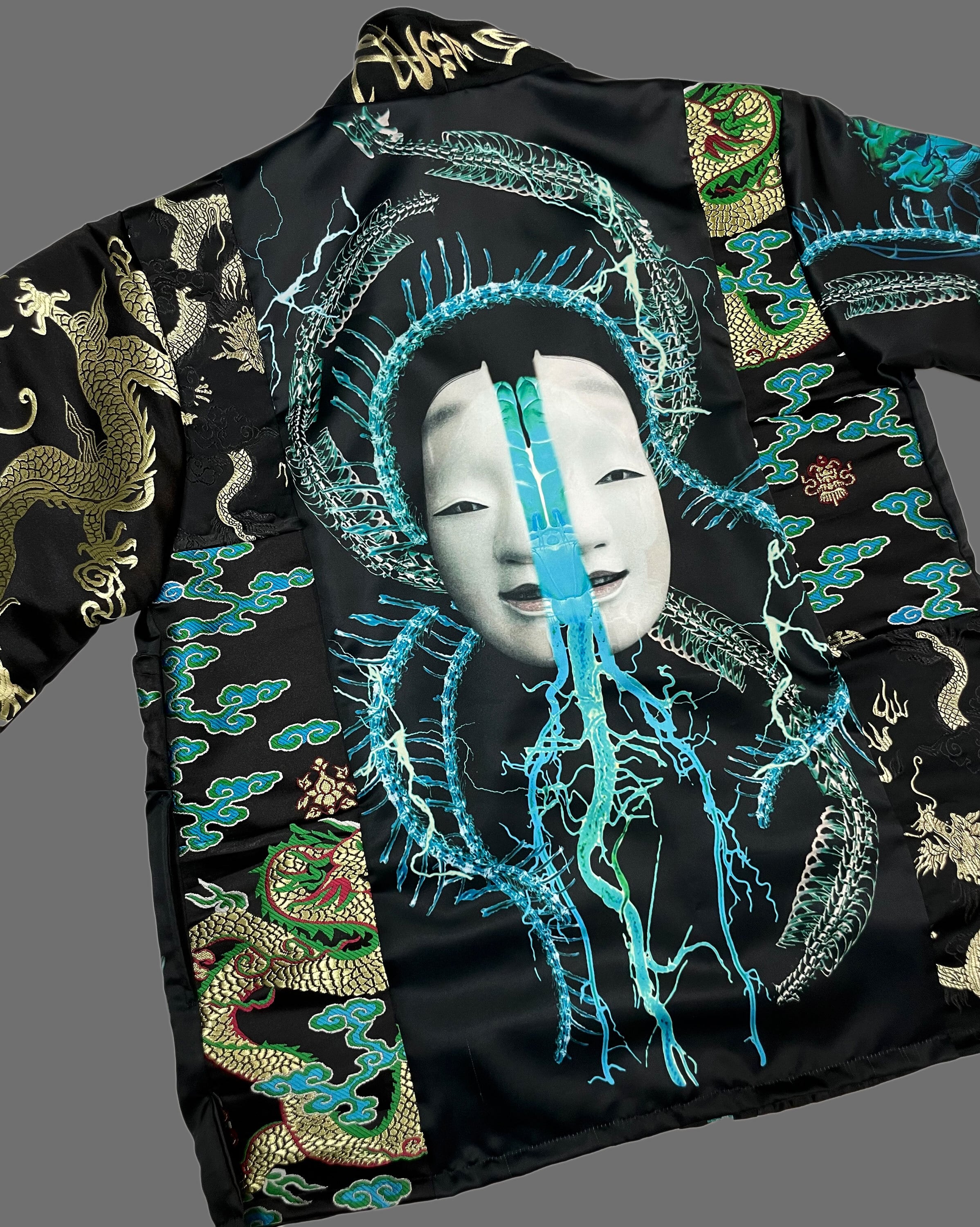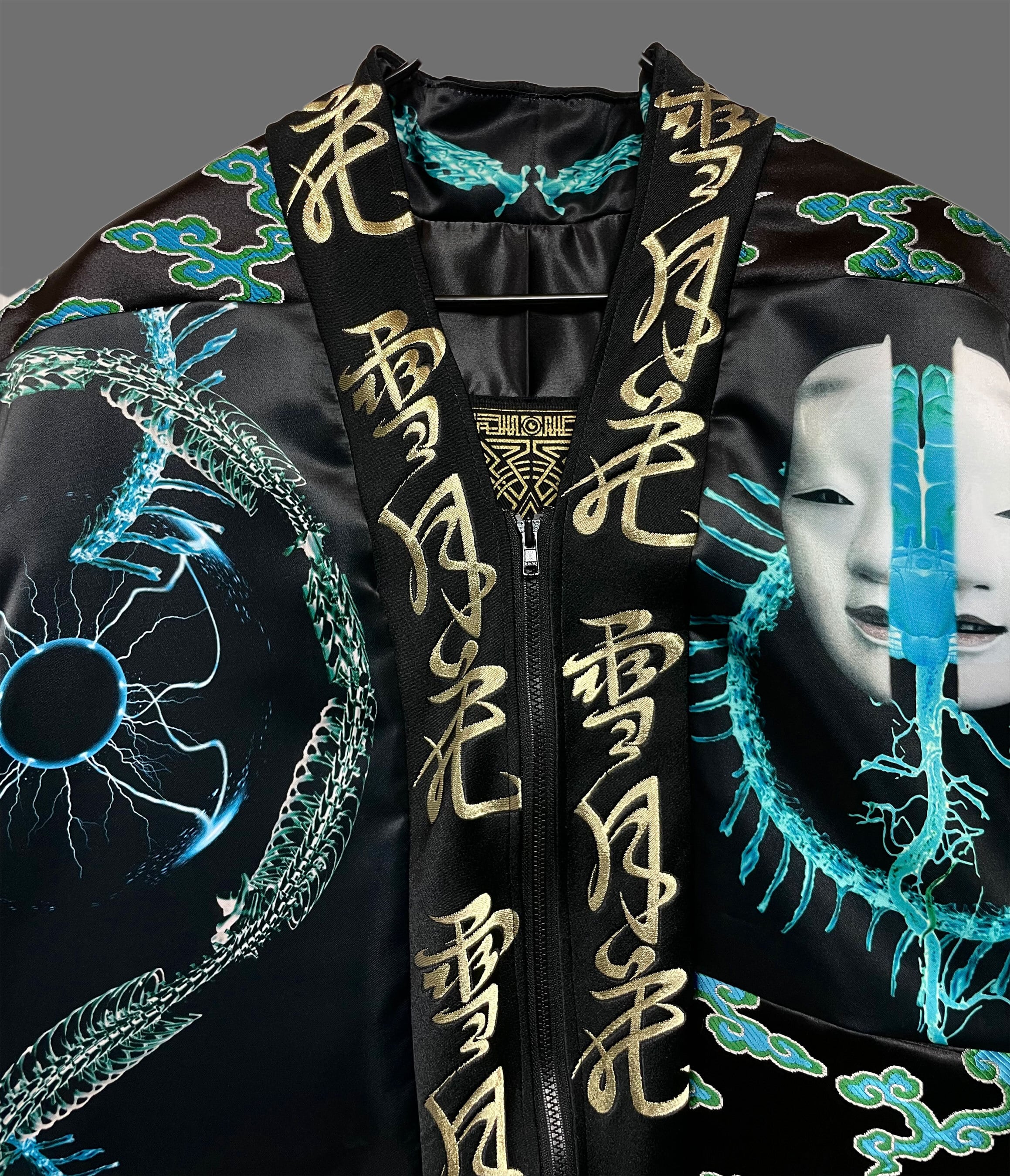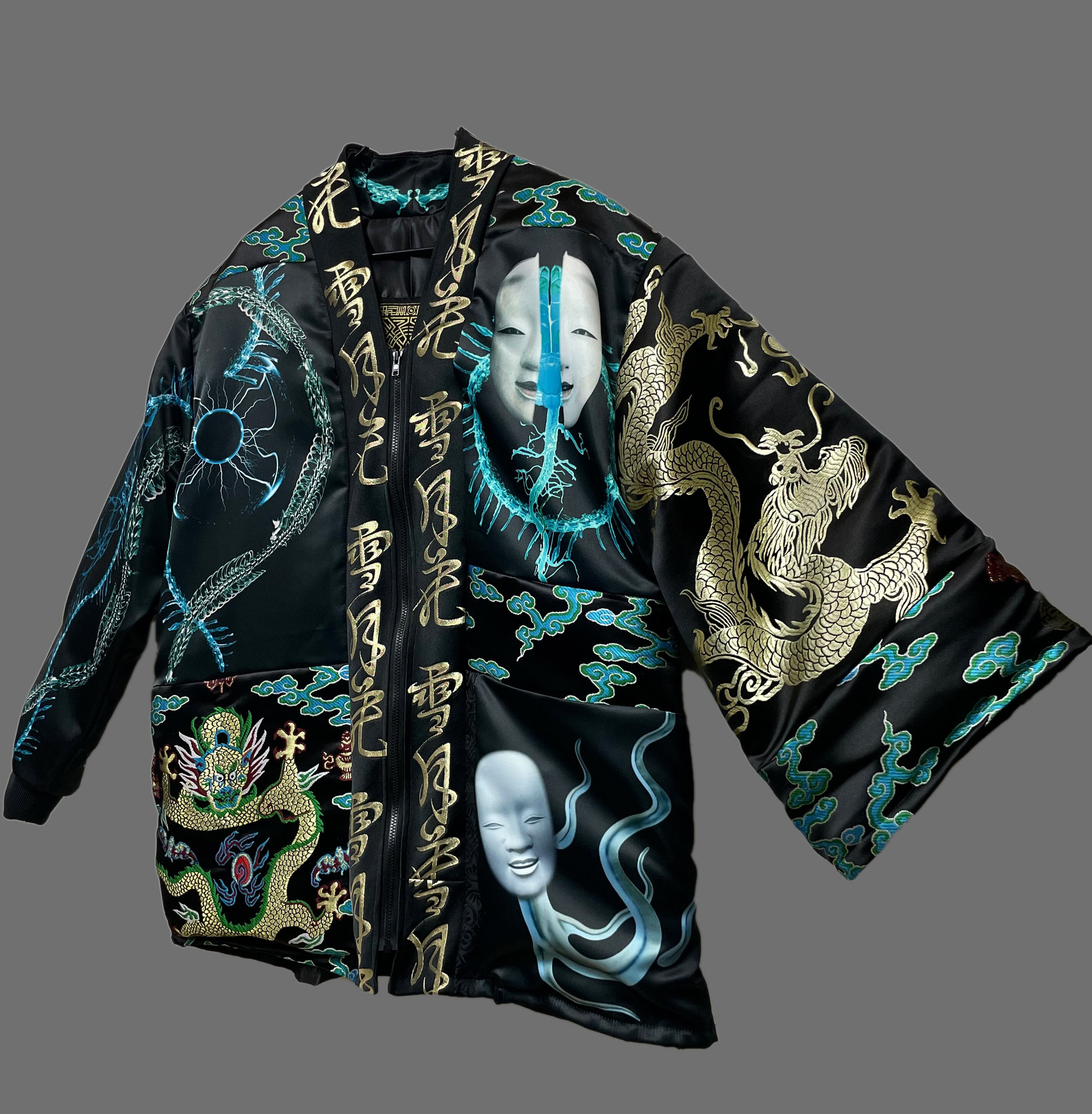 プリント生地(ポリエステルスウェード)と金襴刺繍生地のドッキング羽織となります。